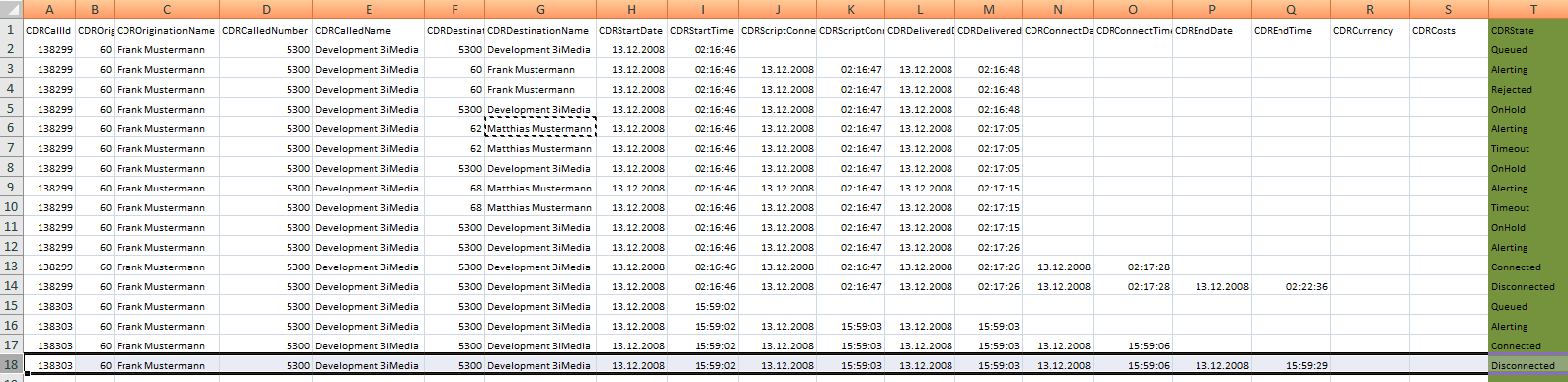 If one of these states differ from the previous state a new CDR-entry is written. The result is a complete call history for each call. These CDR-entries are written for incoming calls, processed by the Queue Controller. The Queue Controller also monitors outgoing calls and direct calls to internal destinations. The logging equals to the logging for incoming call but is not so detailed. The type of a call is written in fields "CDRTypeCDR" or "CDRTypeQueue".