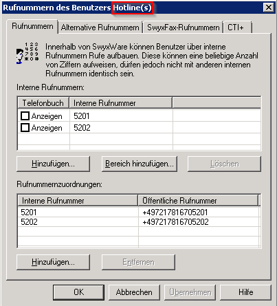 The SwyxWare user used for AdminCenter is called "Hotline(s)". All numbers assigned to this user will be available in AdminCenter automatically.